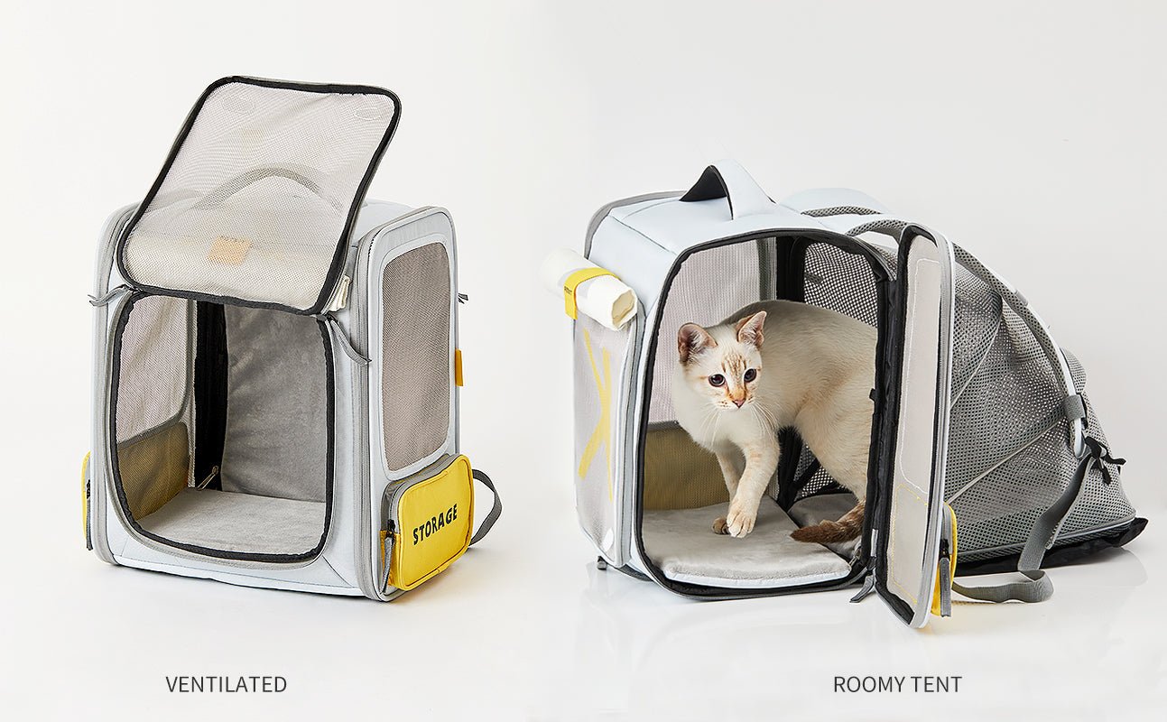 Your pet will have plenty of room to move around, with an extra-large carrier space that provides better vision for your furry friend. The backpack is designed for pets under 6 kg and has dimensions of 35 x 27 x 43 cm (without the tent) and 35 x 56 x 43 cm (with the tent).